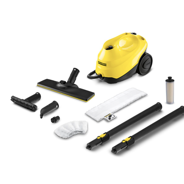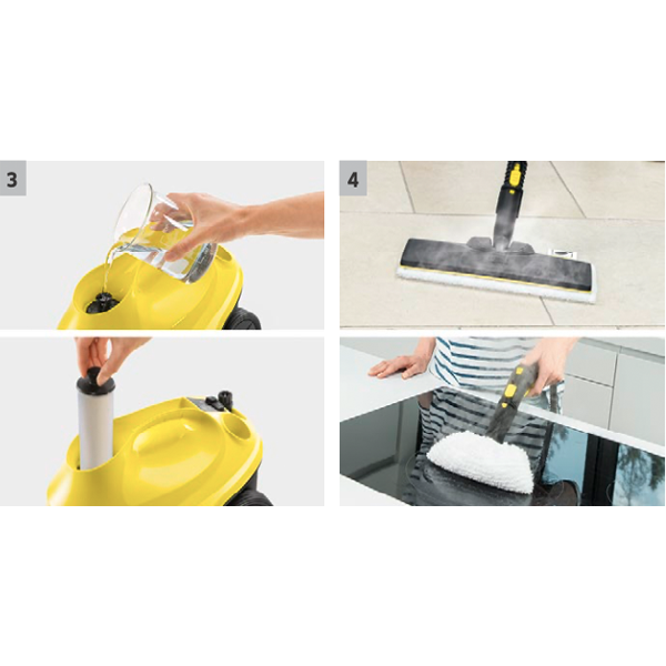 La limpiadora de vapor SC 3 EasyFix con boquilla para suelos EasyFix y cartucho de descalci- ficación permite limpiar sin interrupciones gracias al depósito de agua rellenable de forma permanente. Calentamiento en solo 30 segundos.